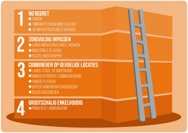 De Constructieve Zonneladder is een handreiking die gebruikt kan worden om in 5 stappen hun eigen, lokale zonne-energie beleid te vormen. De ontwikkeling van zonne-energieprojecten wordt op deze manier in goede banen geleid, door zonnepanelen op voorkeurslocaties te stimuleren en door duidelijke voorwaarden te stellen.