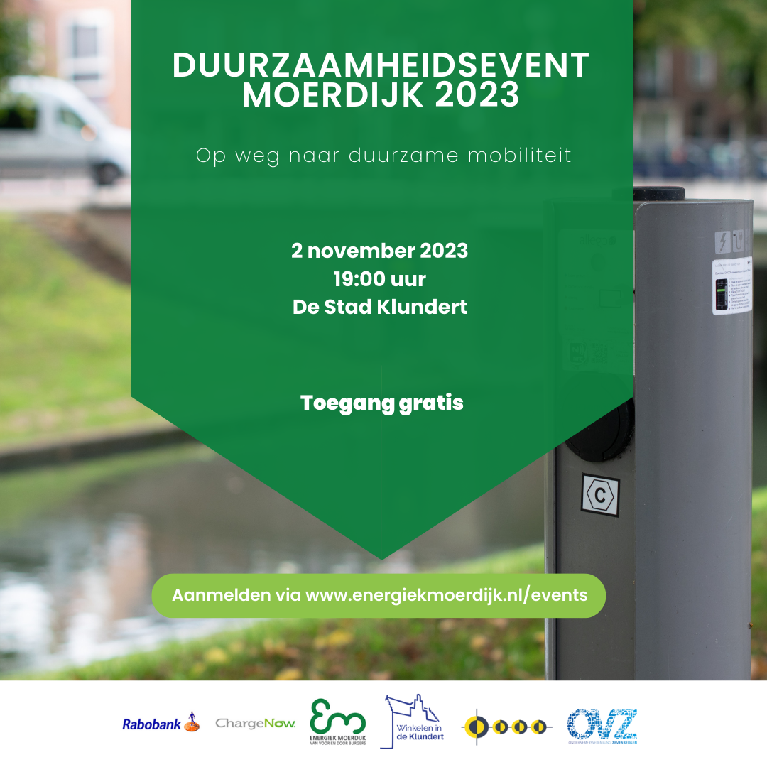 Op 2 november aanstaande organiseren de ondernemersverenigingen Fijnaart, Klundert en Zevenbergen in samenwerking met Energiek Moerdijk, Rabobank en ChargeNow een duurzaamheidsevent voor alle ondernemers uit de gemeente Moerdijk. Vanaf 19.00 uur kan iedereen die zich aangemeld heeft terecht in De Stad Klundert, Molenstraat 33 te Klundert.