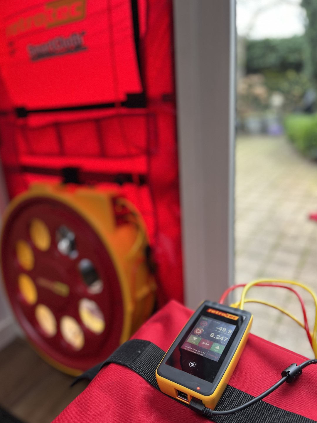 Nadat we een frame hebben geplaatst in één van de buitendeuren van de woning, waarin een zeildoek is aangebracht met een grote ventilator (diameter ca 60 cm). Daarna controleren we of alle ramen en deuren in de buitengevel gesloten zijn en ook alle ventilatieopeningen gesloten zijn. In de woning moeten alle deuren open, zodat er in alle ruimten een onderdruk wordt aangebracht door de ventilator te starten. Deze onderdruk in de woning is relatief gering en komt globaal overeen met windkracht 5 op de buitengevel. In de woning. Binnen in de woning is hier niets van te merken en ook huisdieren merken hier niets van, ze mogen alleen niet naar buiten of binnen.