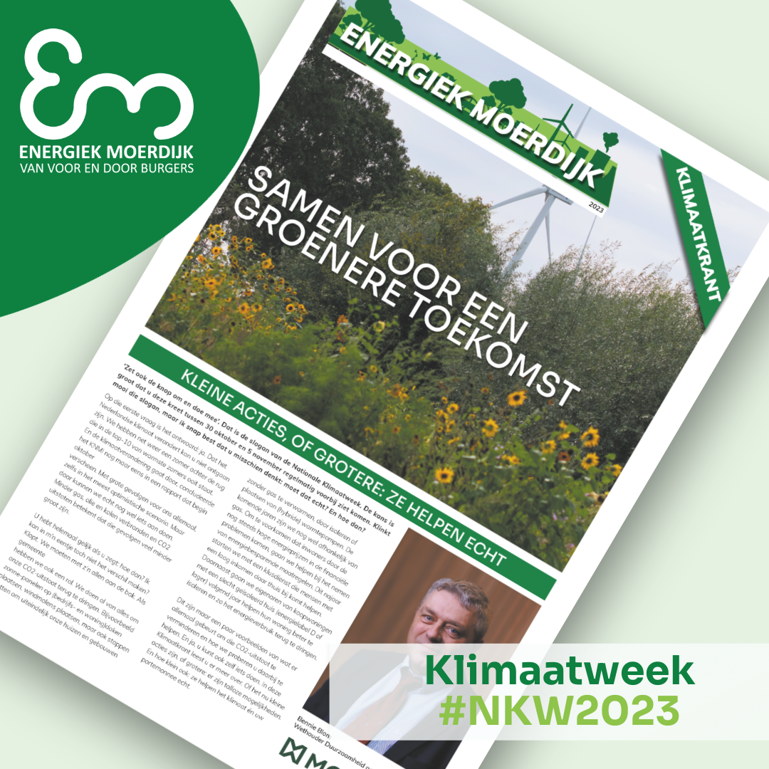 In de Klimaatweek (31 oktober t/m 5 november 2023) valt hij huis-aan-huis op de deurmat: de Klimaatkrant 2023! In samenwerking met de gemeente Moerdijk en vele vrijwilligers hebben we weer een Klimaatkrant samengesteld voor alle inwoners van de gemeente Moerdijk. Boordevol informatie over de energietransitie en handige tips over het besparen van energie. We wensen je veel leesplezier.